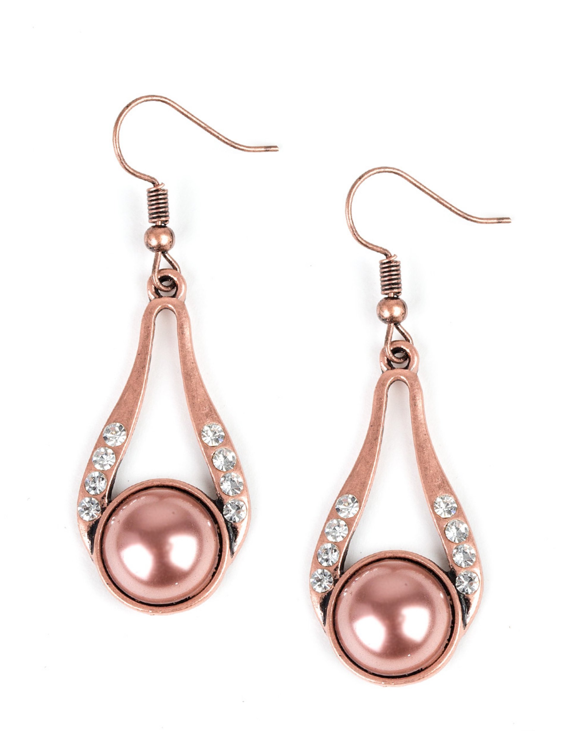 A pealy cooper bead is nested along the bottom of an elegant copper frame radiating with glassy Rhinestones for timeless look.